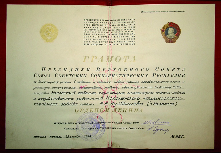 85 лет назад, в апреле 1939 года Указом Президиума Верховного Совета СССР за выдающиеся успехи в создании и освоении новых машин, перевыполнении плана и успешную организацию стахановской работы коллектив Коломенского машиностроительного завода был награжден орденом Ленина. Предприятие стало называться «Коломенский ордена Ленина машиностроительный завод имени В.В Куйбышева».