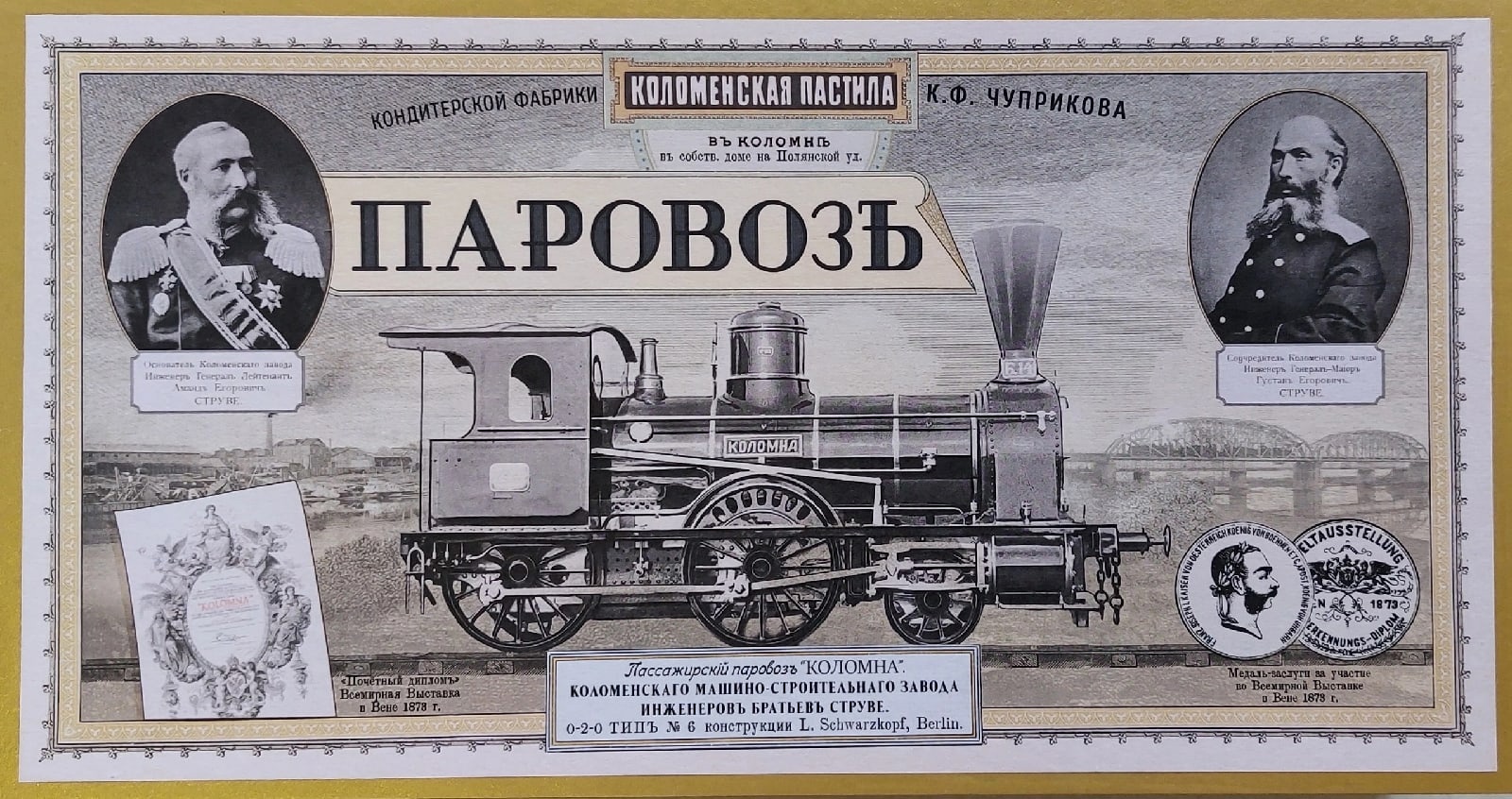 В продажу поступила «Коломенская пастила» в оригинальной коробке с надписью «ПАРОВОЗЪ». На упаковке размещены портреты отцов основателей нашего предприятия — братьев Аманда и Густава Струве, сотый паровоз произведенный Коломенским заводом и названный «Коломна», медали за участие во Всемирной выставке в Вене в 1873 году.