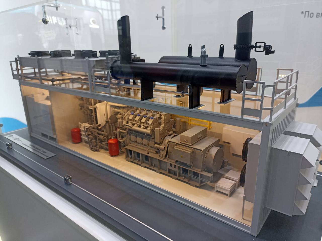 На стендовой экспозиции были представлены макеты современных образцов продукции завода: газопоршневой электростанции ЭГПК-9, на которой в качестве силовой установки используется газопоршневой двигатель-генератор 1-9ГМГ; газодизель-генератора 7ГДГ, дизель-генератора 31-26 ДГ.