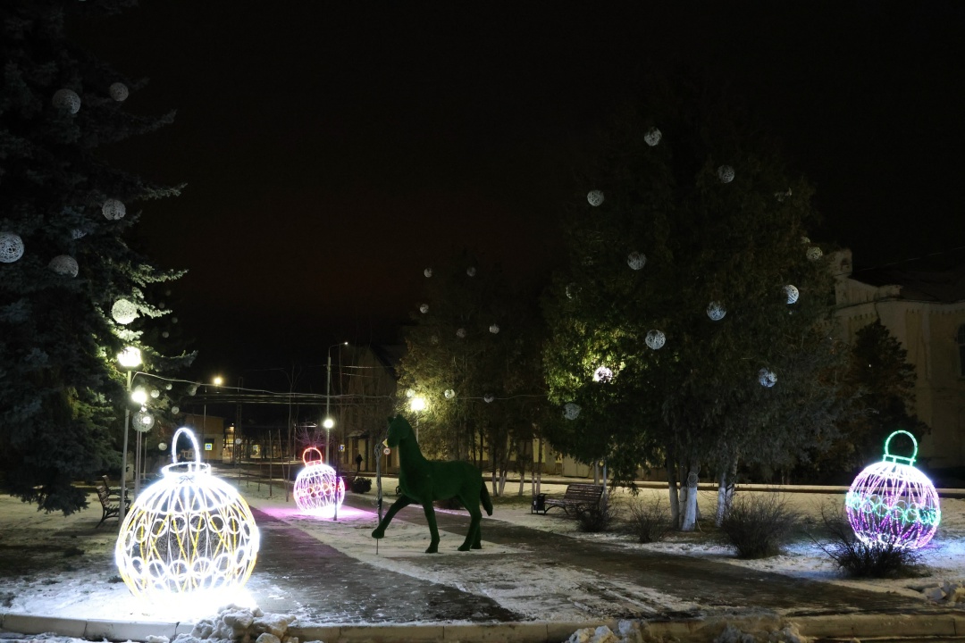 На центральной площади сияет гирляндами огромная роскошная ель. Праздничная иллюминация украшает Аллею славы. Рядом со зданием заводоуправления установлены гигантские елочные игрушки и символ наступающего 2026 года — большая фигура лошади.