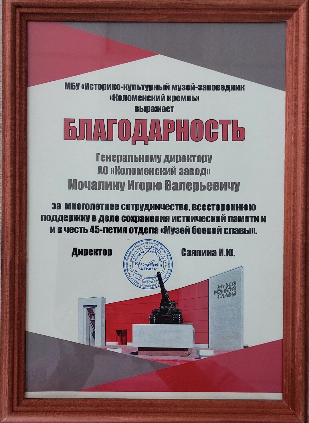 В этом году коломенскому Музею боевой славы исполнилось 45 лет. На юбилейное мероприятие, которое состоялось 27 августа, были приглашены друзья музея, в числе которых был и представитель Коломенского завода.