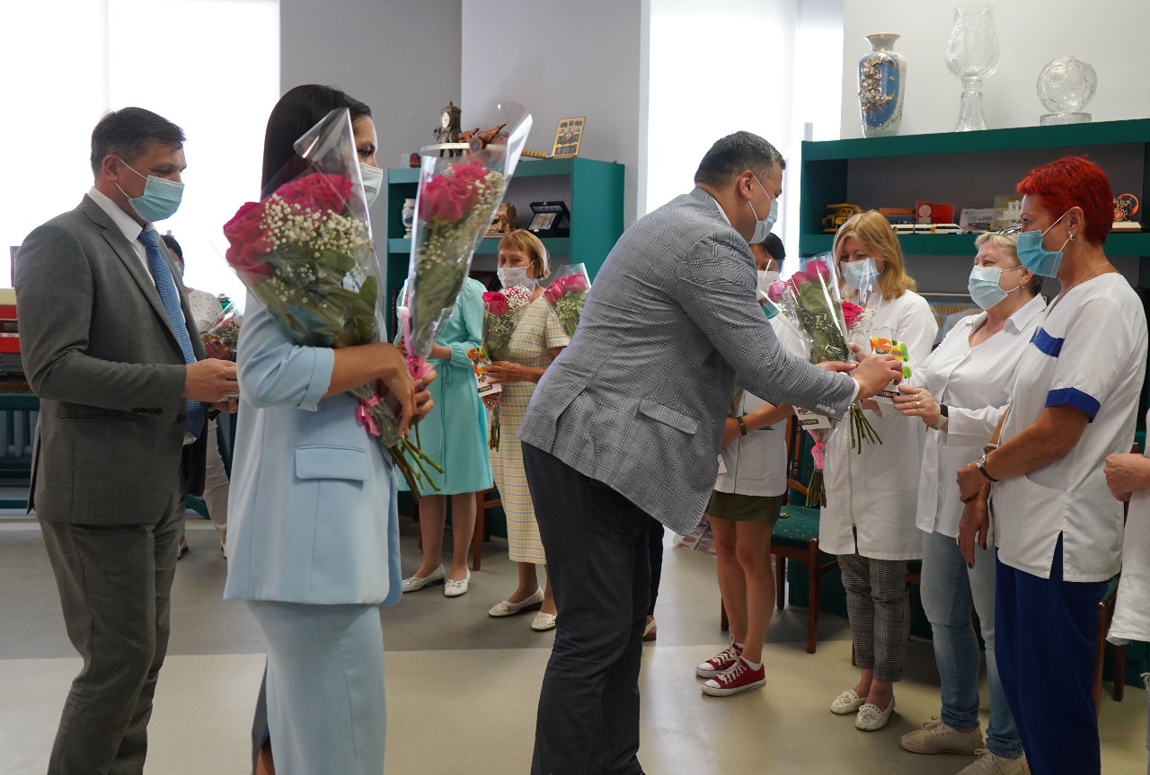 Представители администрации завода вручили медработникам цветы и подарочные сертификаты.