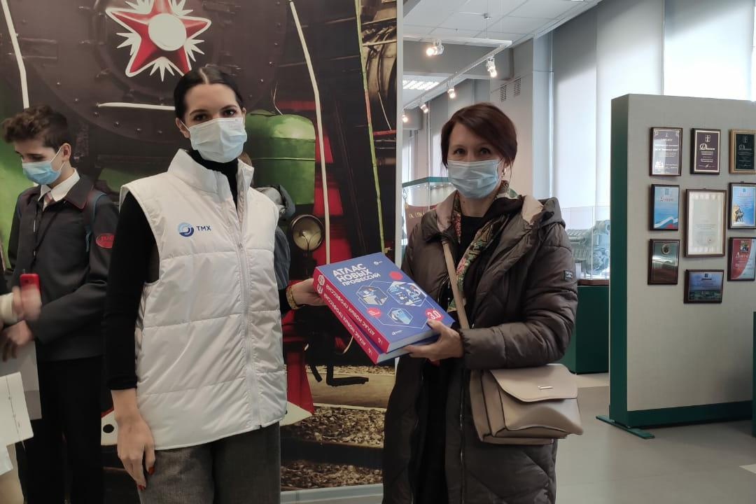 Начальник Центра развития персонала Коломенского завода Роман Зеленков рассказал гостям о перспективах возможного трудоустройства на предприятие, а руководитель административно-социального отдела Елена Ролдугина вручила руководителям группы «Атлас новых профессий» и памятные корпоративные сувениры – юным железнодорожникам.