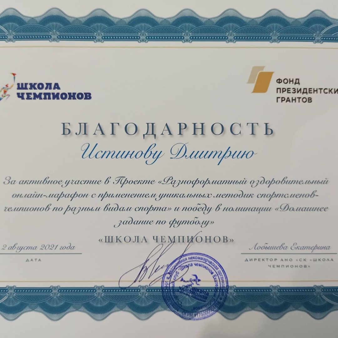 «Проект «Школа чемпионов» рассчитан, в первую очередь, на молодежь. В общем зачете победителями стали не только взрослые, но и дети. С большим удовольствием я участвовал в этом проекте, выполнял все домашние задания. Узнав, что в числе призов будет футбольная форма от Дмитрия Сенникова @sennikov17, очень хотел получить именно ее. В результате, все так и вышло! Помимо того, что Дмитрий Сенников замечательный спортсмен, он также выступает куратором на спортлиге ТМХ. Это особенно ценно! Надеюсь, этот проект найдет дальнейшее развитие, и в нем будет принимать участие ещё большее число молодежи!», – поделился с нами Дмитрий Истинов.
