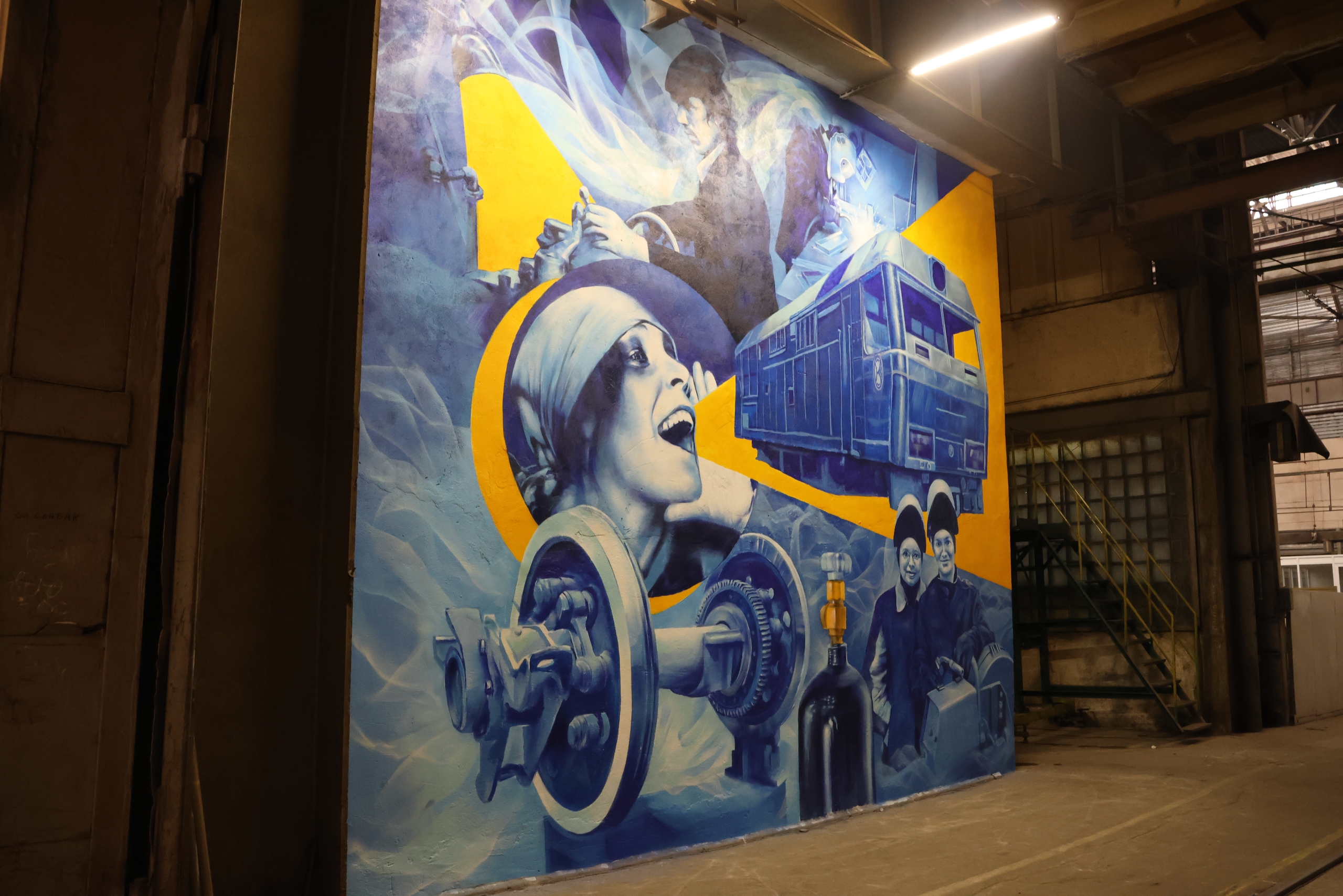 Художники Павел Хомич и Кирилл Рощин создали новую масштабную роспись на стене заготовительно-кузовного цеха Коломенского завода.