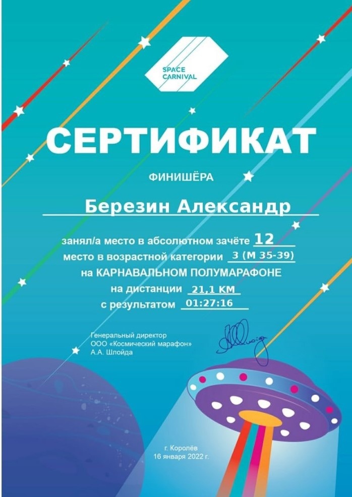 Всего в Карнавальном марафоне приняло участие 1300 разновозрастных спортсменов, которые преодолевали пять разных дистанций. В абсолютном зачете Александр занял 12 место среди всех участников, а в возрастной группе 35-39 лет стал третьим.