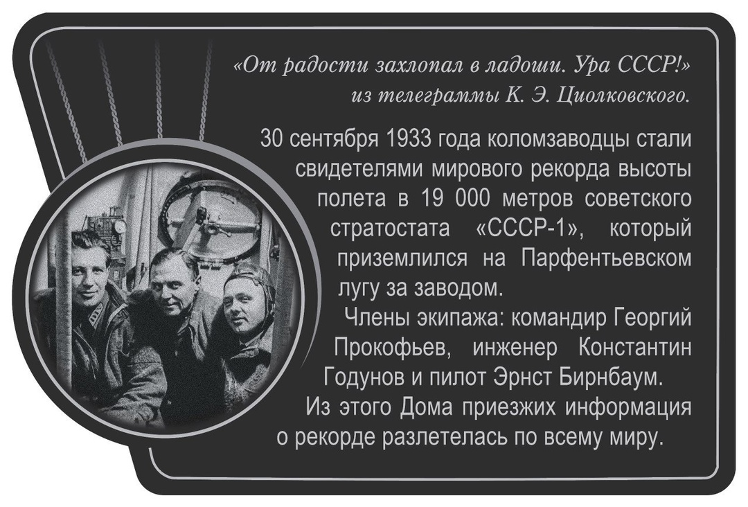 Работники Коломенского завода и студенты профильных учебных заведений приняли участие в открытии мемориальной доски героям-стратонавтам, которые установили мировой рекорд высоты полета. 30 сентября 1933 года на стратостате «СССР-1» они поднялись на высоту 19 000 метров.