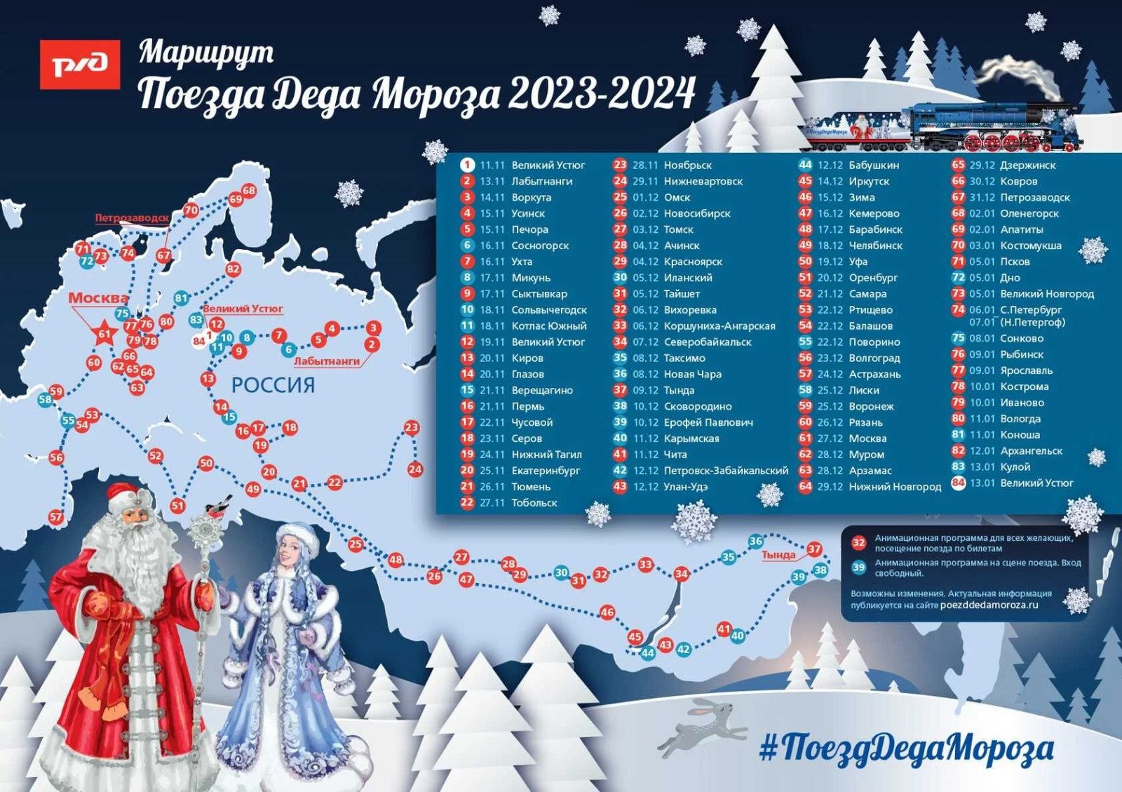 Маршрут поезда проходит в этом году более чем через 70 городов. Везде, где делает остановку «Поезд Деда Мороза», посетителей вокзалов ждёт торжественная праздничная программа с участием артистов и аниматоров, которая позволит окунуться в атмосферу зимней сказки и волшебства.