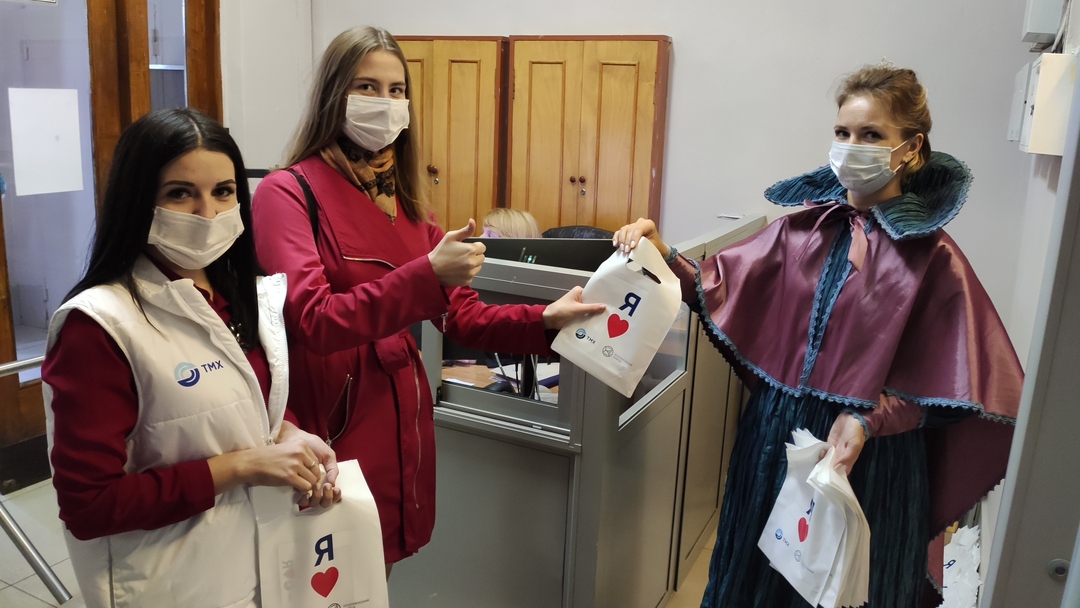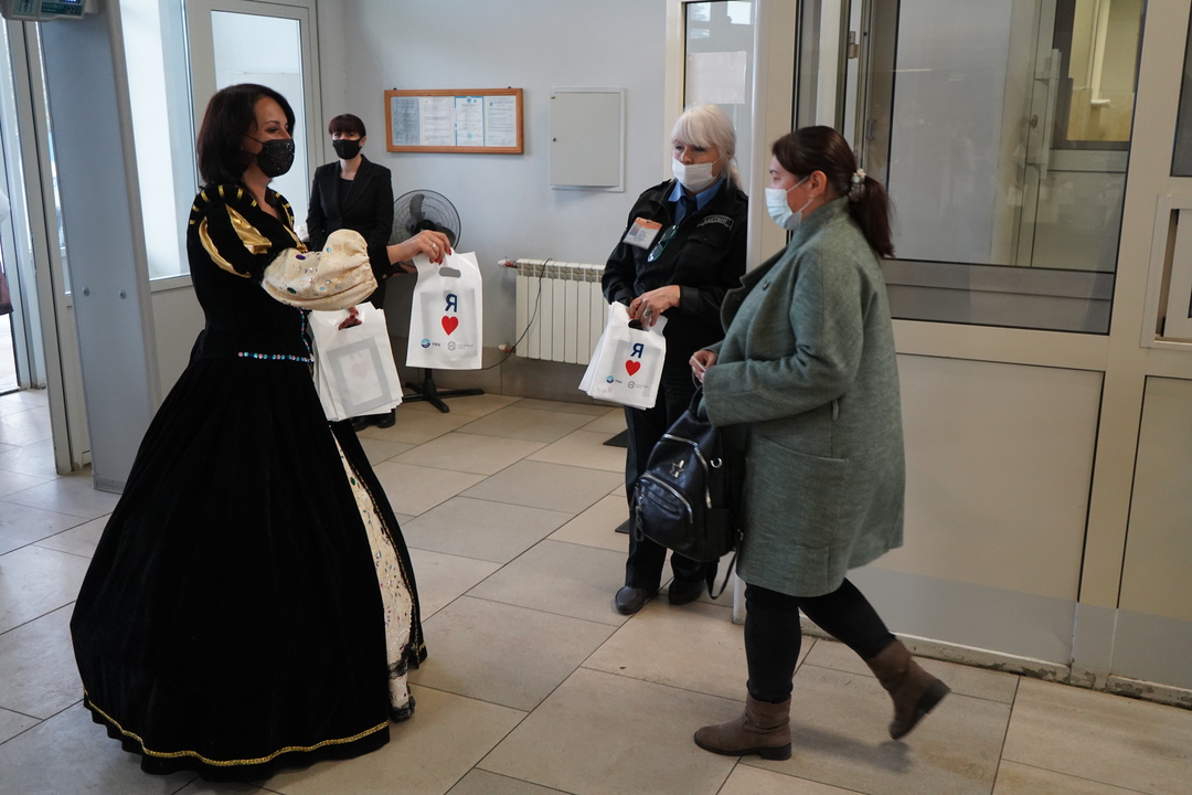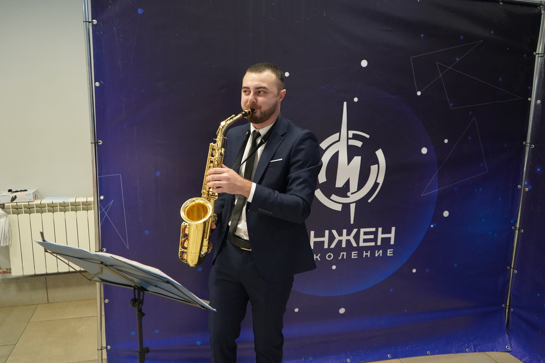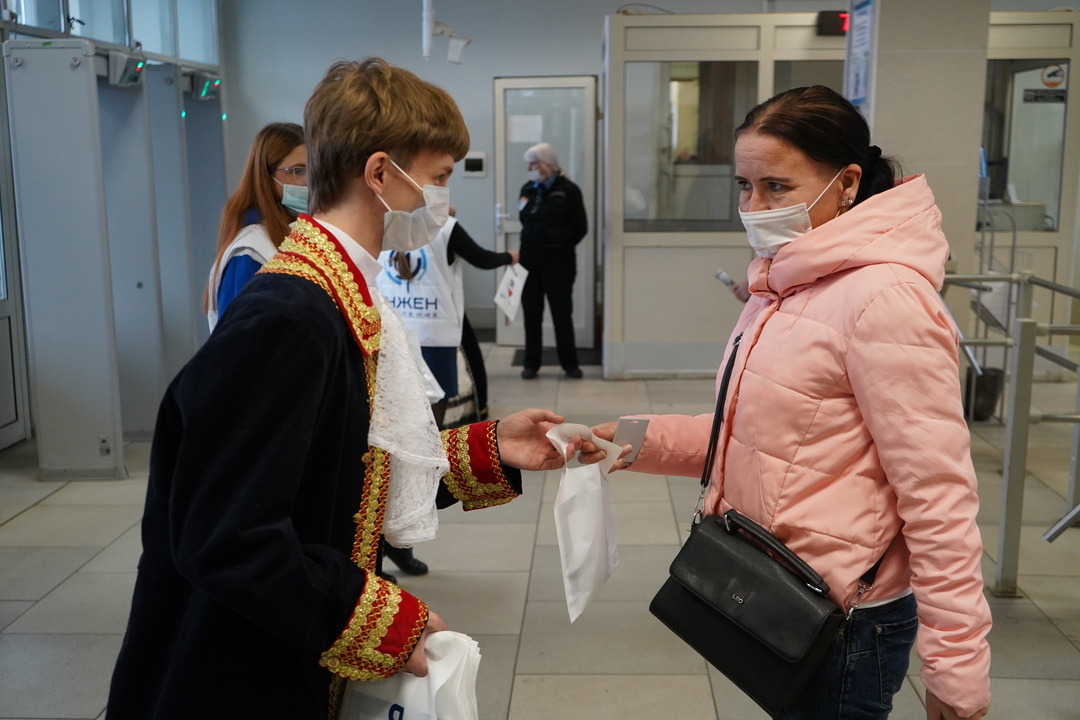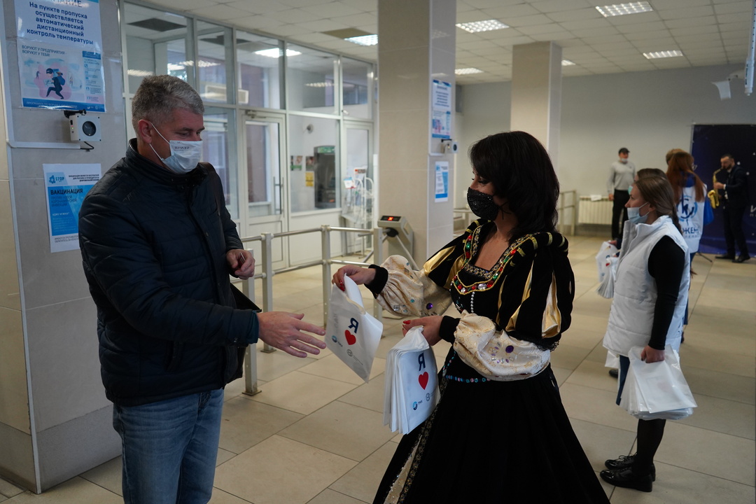 С самого раннего утра на всех проходных члены молодежного движения "Инжен" и приглашенные дамы и кавалеры под живую музыку вручали заводчанам памятные сувениры: фирменный пакет, фоторамку и значок.