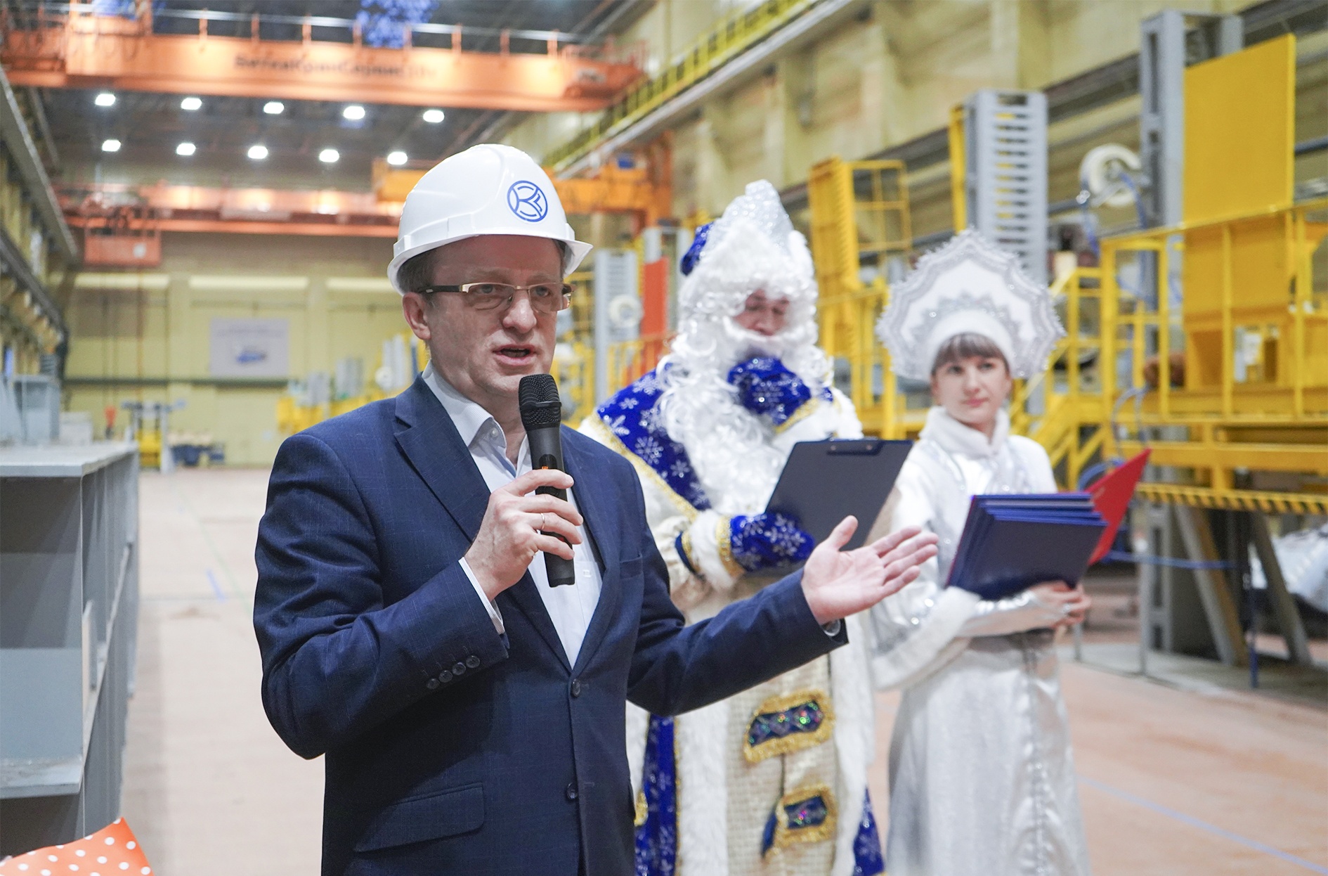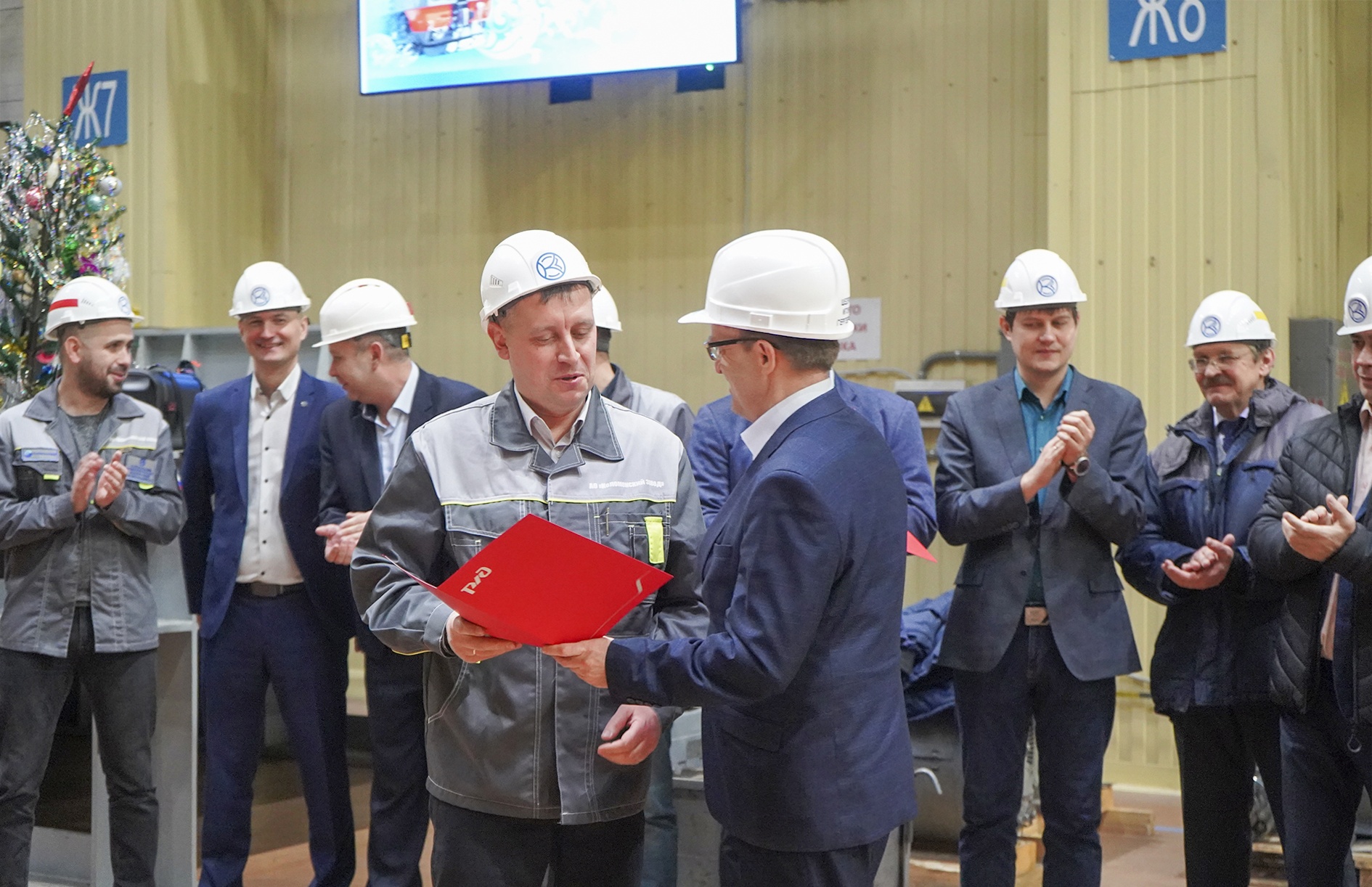 Дед Мороз и Снегурочка пожелали работникам Коломенского завода дальнейших успехов в создании надежных двигателей, пассажирских тепловозов ТЭП70БС и электровозов ЭП2К и вручили сладкие подарки коллективу механического цеха №63 – победителю конкурса на лучшее украшение своего рабочего места.