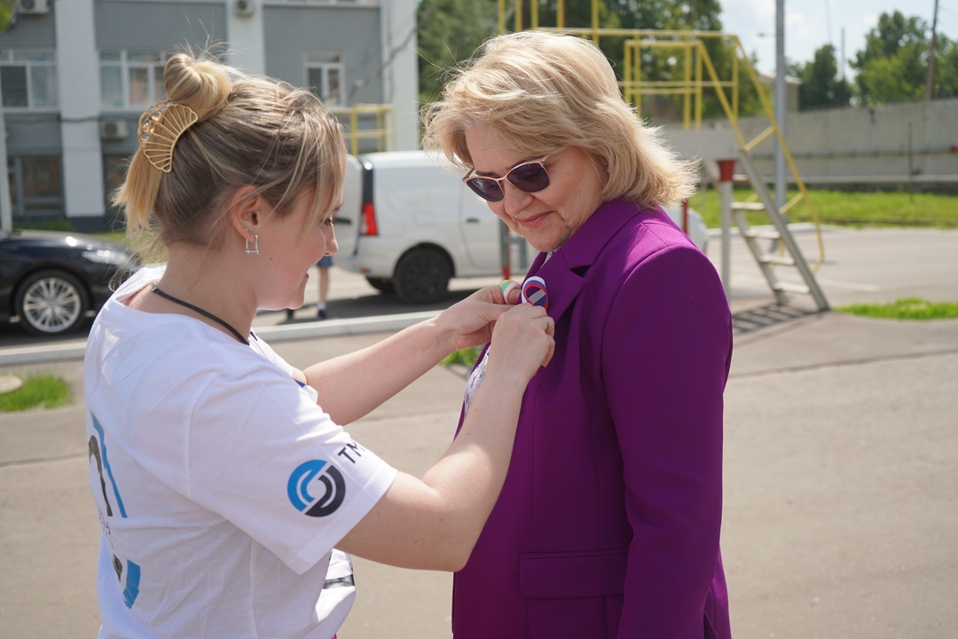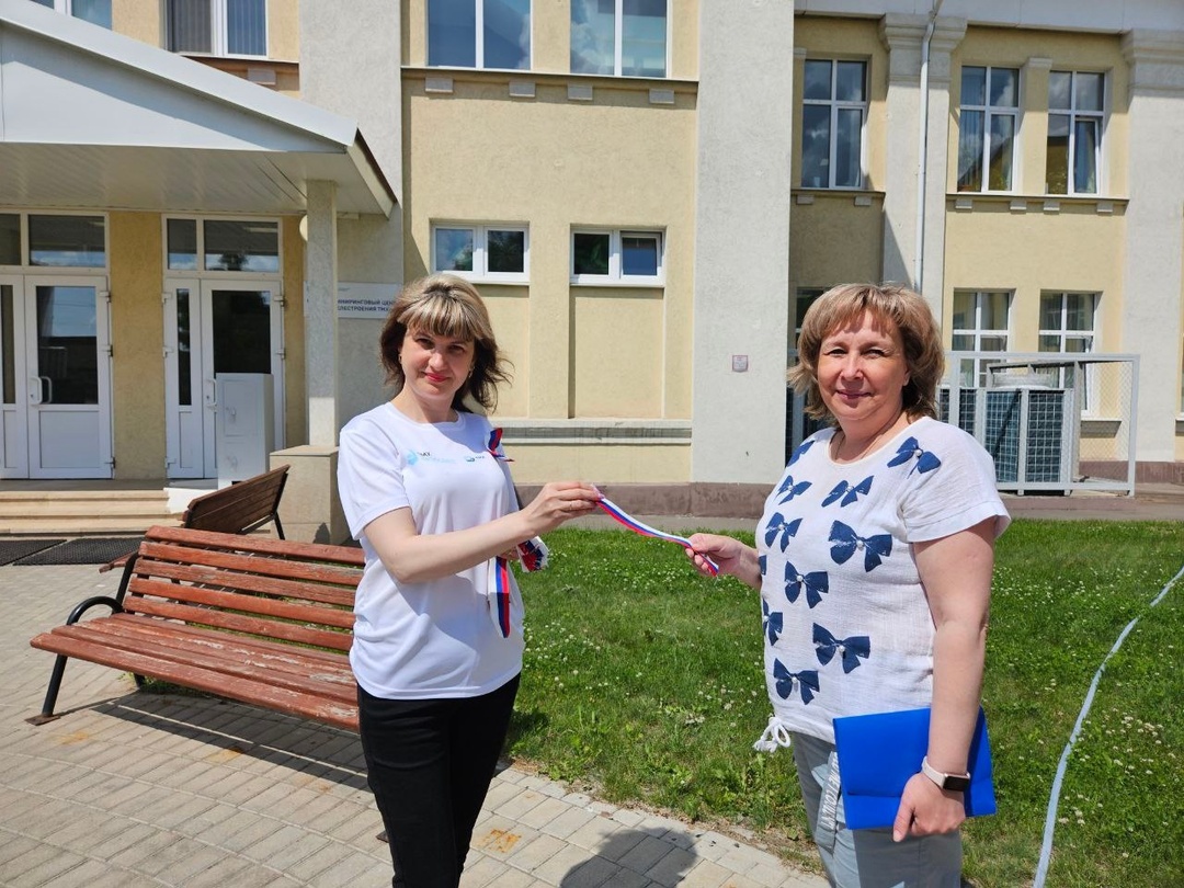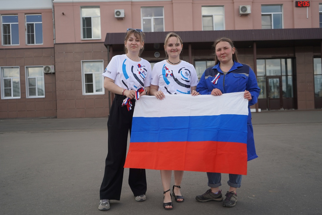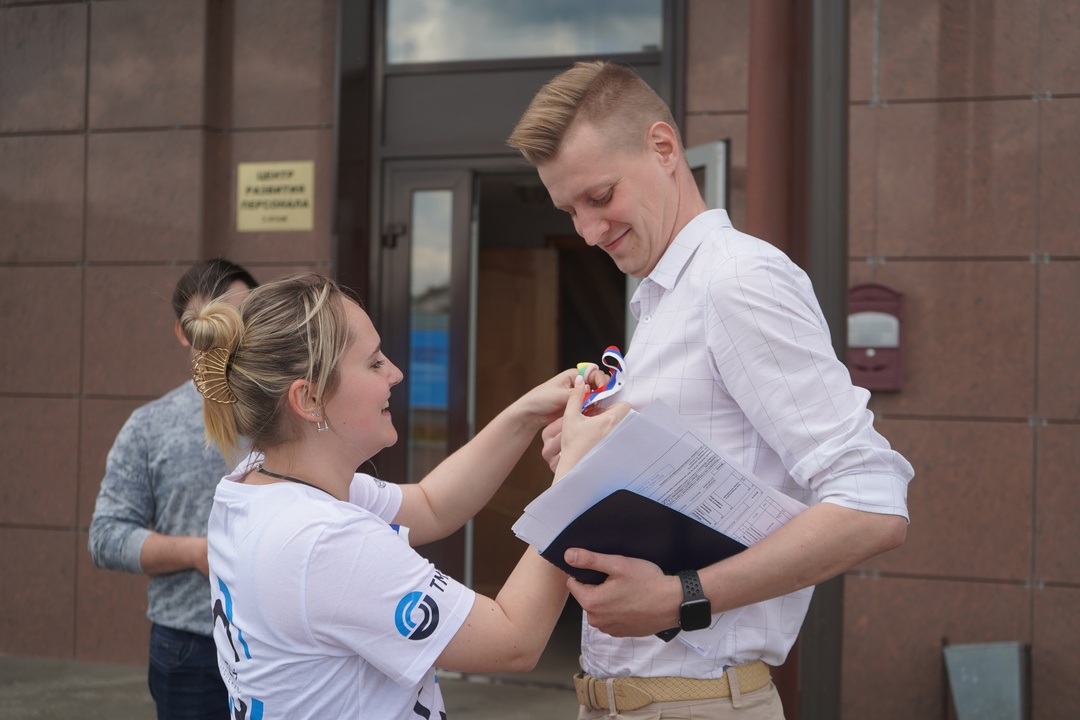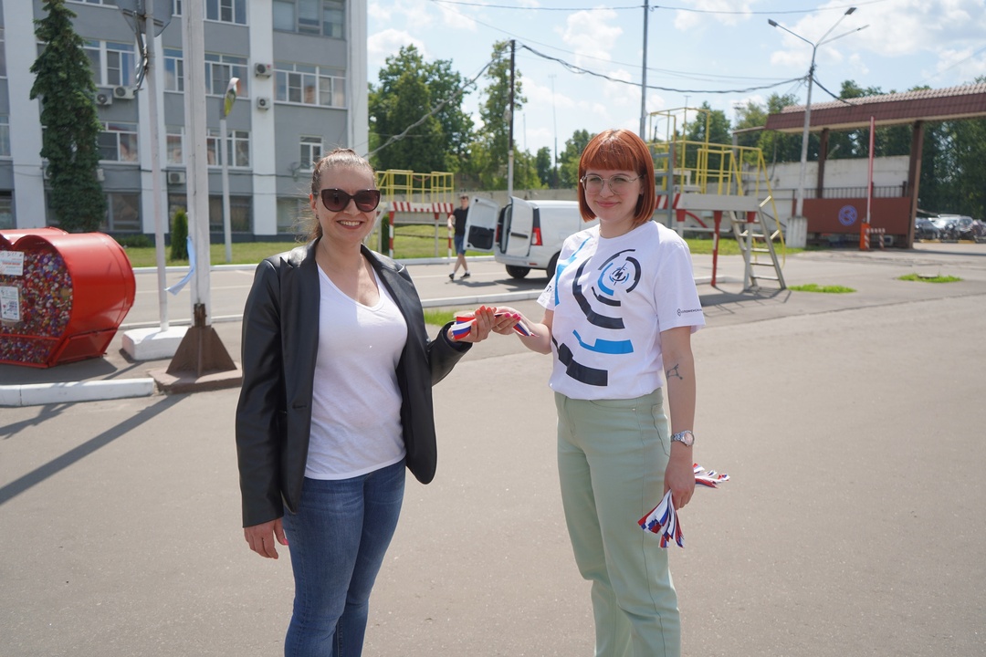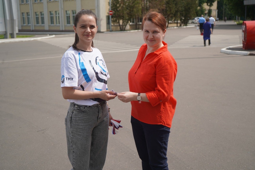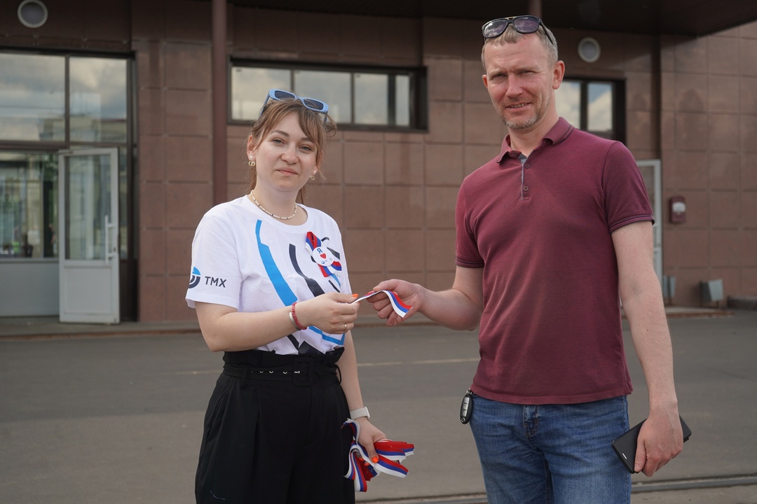 На проходных предприятия представители молодежного движения Инжен и ТМХ-Профсоюз раздавали ленточки с государственной символикой.