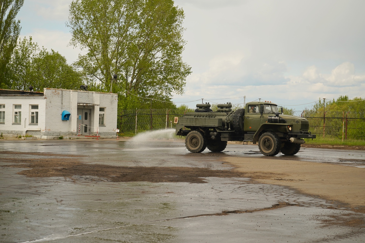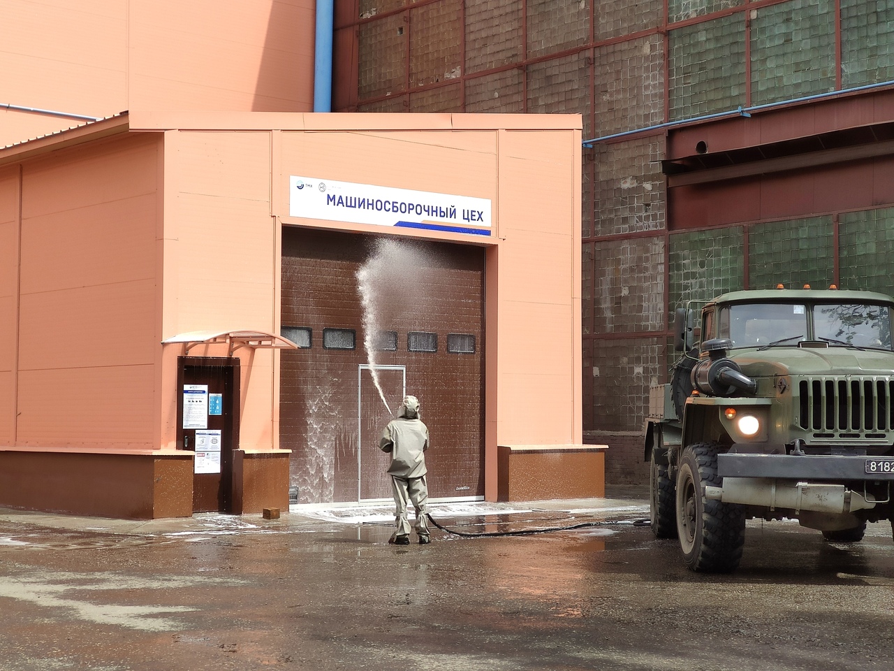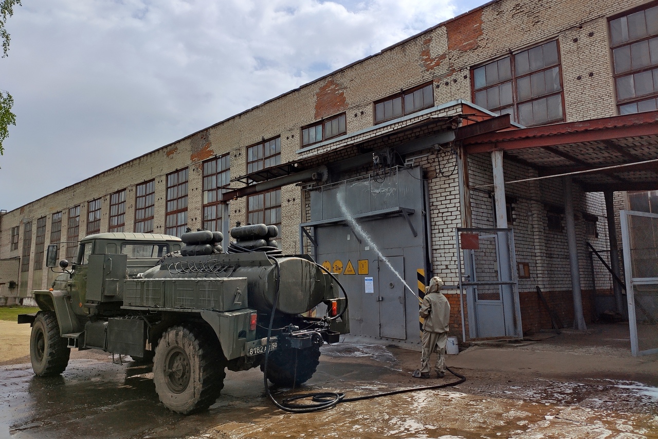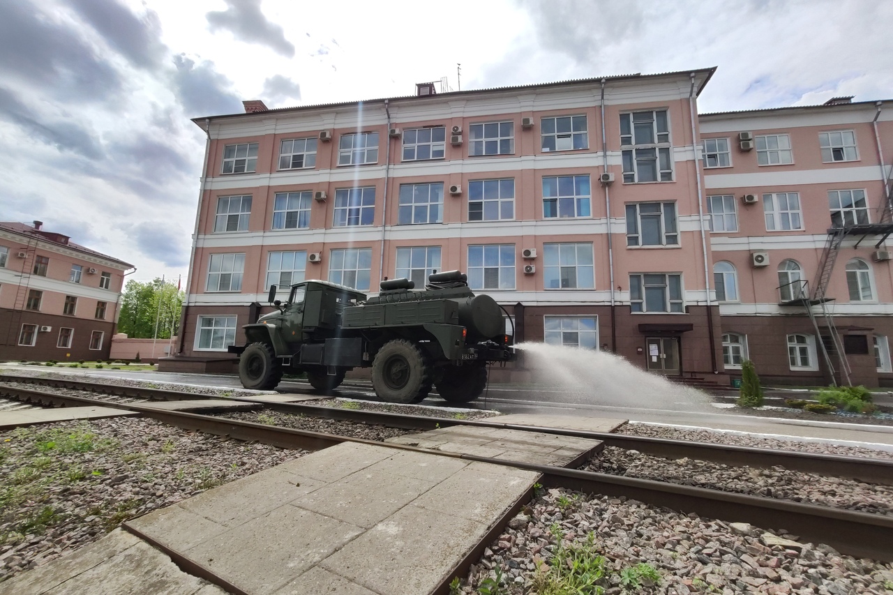 16 мая на Коломенском заводе (входит в Трансмашхолдинг) военнослужащие Западного военного округа обработали территорию с применением специальной машины АРС-14У.