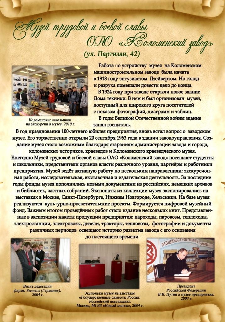 Коллектив ОАО «Коломенский завод» принял участие в праздничных мероприятиях, приуроченных ко Дню города 11 июня город Коломна отмечал 835-летний юбилей. В рамках празднования Дня города состоялось шествие трудовых коллективов предприятий, в котором приняли участие многие работники Коломенского завода. 11 июня город Коломна отмечал 835-летний юбилей. В рамках празднования Дня города состоялось шествие трудовых коллективов предприятий, в котором приняли участие многие работники Коломенского завода. Шествие проходило по главной улице города — Октябрьской революции и заканчивалось на Соборной площади, где и состоялось открытие праздника. В исторической части города, на улице Лажечникова были представлены многочисленные экспозиции народных умельцев, работы фотохудожников, базар кукол и пр. Распахнул свои двери Краеведческий музей, во внутреннем дворике которого расположилась выставка «Фестиваль городских музеев». Музей трудовой и боевой славы ОАО «Коломенский завод» экспонировал на выставке собственные уникальные фонды, среди которых наибольшей популярностью у посетителей пользовались: заводской гудок 1872 года создания, паспорта заводских династий и баннер-конструкция с изображением 100-ого коломенского паровоза. Справочно: Музей трудовой и боевой славы ОАО «Коломенский завод» расположен непосредственно на предприятии, ежегодно его посещают более 2000 человек — представители органов власти различного уровня, партнеры и работники предприятия, студенты и школьники. Музей ОАО «Коломенский завод» ведет активную работу по нескольким направлениям: экскурсионная работа, исследовательская, выставочная и издательская деятельность. За последние годы фонды музея пополнились новыми документами из российских, немецких архивов и библиотек, частных собраний. Экспонаты из коллекции музея экспонировались на нескольких выставках в Москве, Санкт-Петербурге, Нижнем Новгороде, Хельсинки. На базе музея реализуются культурно-просветительские проекты. Формируется цифровой музейный фонд. Важным итогом проведенных работ стало издание нескольких книг.