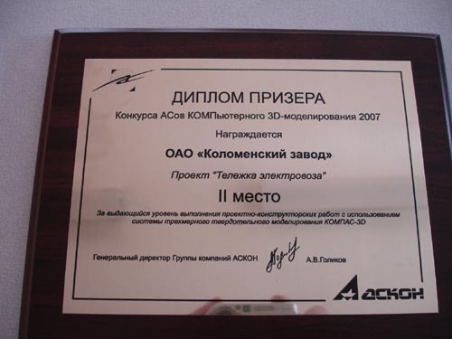 Молодые конструкторы-локомотивостроители стали призерами «Конкурса АСов КОМПьютерного 3D моделирования» По итогам пятого конкурса 3D моделирования среди пользователей программы «Компас» конструкторы Коломенского завода заняли 2 место. «Конкурс АСов КОМПьютерного 3D моделирования» проводила компания АСКОН, занимающаяся разработкой и внедрением новых информационных технологий, в основном для промышленных предприятий. В этом году в конкурсе приняли участие 52 проекта 43-х предприятий из различных регионов России и стран СНГ. Коломенский завод, участвовавший в конкурсе третий раз, представляли инженеры-конструкторы УГКЛ Виталий Жданов, Алексей Романский, Сергей Плеханов, Сергей Кропачев. Представленная на конкурс 3D модель тележки электровоза ЭП2К, состояла из более 7000 единиц деталей. Организаторы конкурса отметили критерии успеха проектов-призеров: параметризация эскизов с управляющими размерами, сопряжения в сборках, активное использование всех возможностей КОМПАС-3D: гибки, штамповки, массивы, макроэлементы; содержание сложных деталей и подсборок, качественно проработанные узлы. По мнению участников конкурса, с каждым годом усложняются его условия: повышаются требования к количеству деталей в сборке, к сложности самой сборки. Особое внимание жюри обращает на полноту использования программы «Компас» при выполнении конкурсной работы. Кроме того, участие в конкурсе стимулирует рождение новых идей, обогащает опыт использования системы САПР «Компас» при конструировании заводской продукции. Трехмерное моделирование дает полное представление о дизайне конструкции, о взаимодействии узлов и деталей в модели. И уже до начала сборки, в процессе производства можно не только выявить неточности конструкции и устранить их, но и сопроводить технологические процессы сварки, сборки объемными, трехмерными «картинками» деталей, узлов, что поможет исполнителям, рабочим наглядно видеть цель своей работы и выполнять ее более качественно. Награждение победителей конкурса состоялось в Москве в конференц-зале отеля «Novotel Moscow Center». Участники, представившие наиболее интересные модели (среди них и ОАО «Коломенский завод»), получили право выступить с докладами. Конструктор УГКЛ Алексей Романский в своем выступлении рассказал об особенностях модели тележки электровоза ЭП2К и самого локомотива первого отечественного пассажирского электровоза постоянного тока, и о предприятии. Творческий коллектив награжден Дипломом призера за выдающийся уровень выполнения проектно-конструкторских работ с использованием системы трехмерного твердотельного моделирования КОМПАС-3D и Кубком.