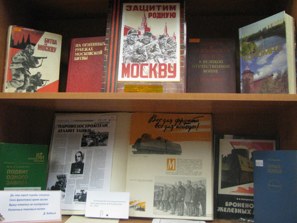 «Начало великой победы. Битва за Москву»: 70 лет спустя 29 ноября 2011 в коломенской Центральной городской библиотеке им. В.В. Королева состоялся вечер памяти «Начало великой Победы. Битва за Москву», посвященный 70-летию победы советской армии над фашистами в битве за Москву. 29 ноября 2011 в коломенской Центральной городской библиотеке им. В.В. Королева состоялся вечер памяти «Начало великой Победы. Битва за Москву», посвященный 70-летию победы советской армии над фашистами в битве за Москву. Почетными гостями мероприятия стали председатель Коломенского клуба краеведов Александр Евгеньевич Денисов, краевед, писатель, журналист Анатолий Иванович Кузовкин, ветеран вооруженных сил Эдуард Васильевич Харитонов, краевед Юрий Николаевич Запевалов, руководитель и командир поискового отряда «Вечный огонь» Алексей Коленченко. Ведущий библиограф Центральной городской библиотеки им. В.В. Королева Татьяна Владимировна Колотухина отметила, что «экспозиция подготовлена для того, чтобы вспомнить события тех лет, и представляет вниманию гостей мероприятия уникальные печатные издания, книги, письма, журналы, газеты, фотографии, документы военных лет, артефакты с мест сражения, художественную литературу, мемуары и воспоминания, посвященные битве за Москву». Все эти частички памяти удалось по крупицам найти и собрать на единой площадке благодаря помощи коломенских краеведов, поисковых отрядов, граждан нашего города. Так, Юрий Николаевич Запевалов предоставил библиотеке на время выставки уникальную книгу «Москва военная. 1941-1945 гг.», которая содержит массу рассекреченных документов военных лет. А поисковый отряд «Вечный огонь» проиллюстрировал экспозицию рассказывающей о деятельности отряда фотовыставкой «Вахта памяти—2011». Большое внимание организаторы экспозиции уделили коломенским производствам, в числе которых — Коломенский завод — «предприятие, работавшее на благо советской армии, помогавшее городу, да и всей стране одержать победу над немецкими захватчиками». Лично познакомиться с представленными материалами и посетить выставку коломенцы могут до 20 декабря 2011 года.