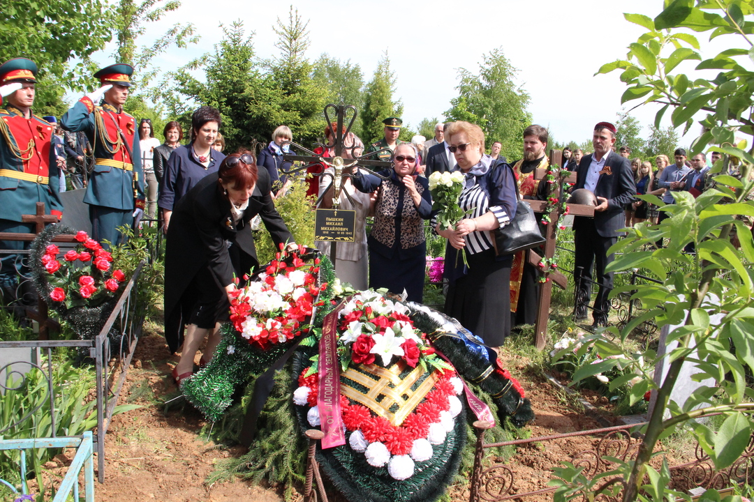 Погребение останков Михаила Михайловича Пышкина с отданием всех воинских и духовных почестей прошло на родовом, Новом Городищенском, кладбище, где похоронены близкие солдата. Теперь он лежит рядом со своей женой Софьей, которая спустя 76 лет "дождалась" мужа с фронта.