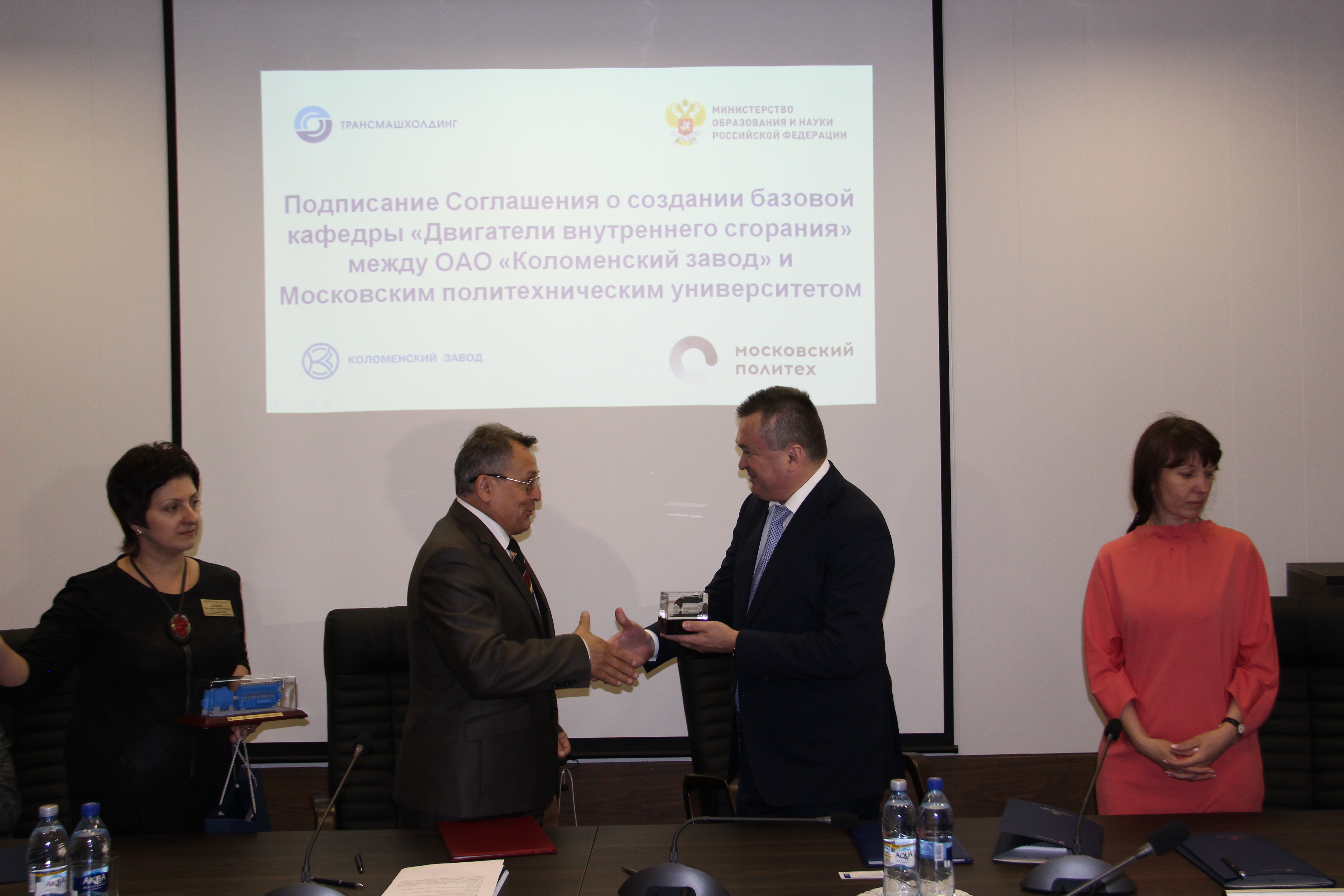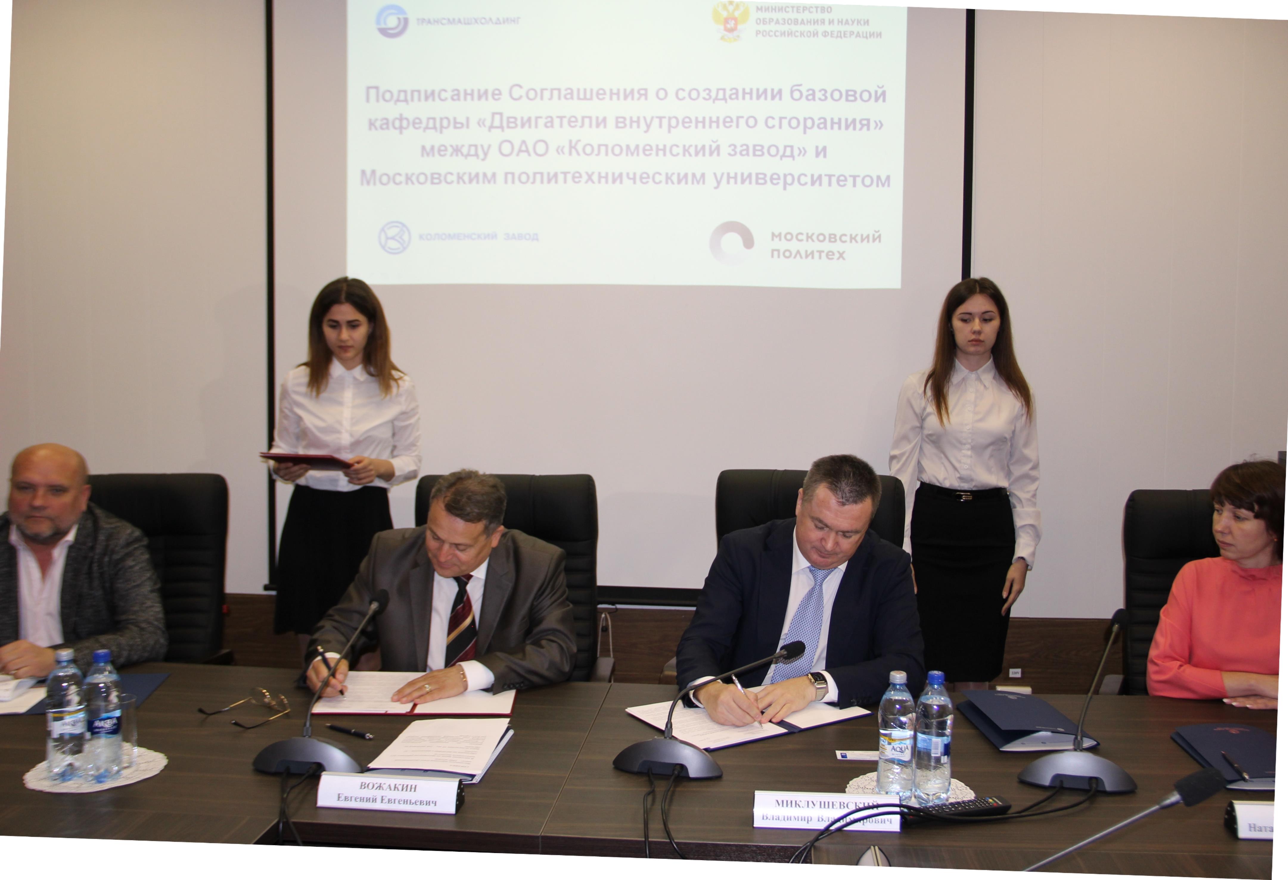 Соглашение о создании базовой кафедры «Двигатели внутреннего сгорания» подписали генеральный директор ОАО «Коломенский завод» Евгений Евгеньевич Вожакин и ректор Московского политехнического университета (МПУ) Владимир Владимирович Миклушевский.