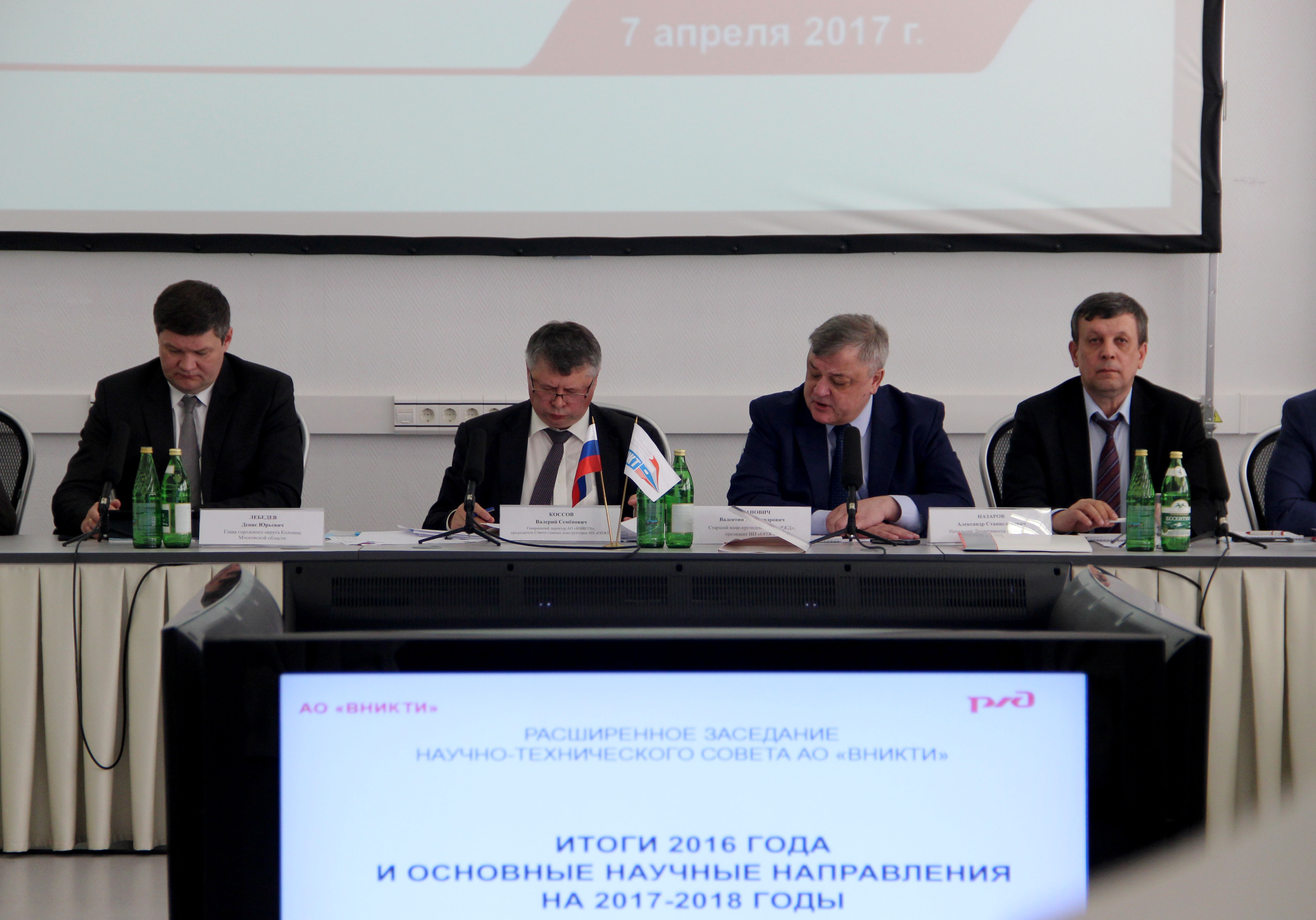 СОВМЕСТНОЕ ЗАСЕДАНИЕ СОВЕТА ГЛАВНЫХ КОНСТРУКТОРОВ НП «ОПЖТ» И «ВНИКТИ» 7 апреля 2017 года в Коломне под председательством старшего вице-президента ОАО «Российские железные дороги» и президента НП «Объединение производителей железнодорожной техники» Валентина Гапановича состоялось совместное заседание совета главных конструкторов НП «ОПЖТ» и научно-технического совета АО «Научно-исследовательский и конструкторско-технологический институт подвижного состава» (АО «ВНИКТИ»). 7 апреля 2017 года в Коломне под председательством старшего вице-президента ОАО «Российские железные дороги» и президента НП «Объединение производителей железнодорожной техники» Валентина Гапановича состоялось совместное заседание совета главных конструкторов НП «ОПЖТ» и научно-технического совета АО «Научно-исследовательский и конструкторско-технологический институт подвижного состава» (АО «ВНИКТИ»). В работе заседания приняли участие ученые, конструкторы и специалисты департаментов и дирекций ОАО «РЖД», ОАО «ВНИИЖТ», ОАО «Коломенский завод», ФГУП «ВИАМ», Инженерного центра АО «УК БМЗ», АО «Пензадизельмаш», МИИТ, МГТУ им. Н.Э. Баумана, НИУ «Высшая школа экономики» и др. Открывая заседание, генеральный директор АО «ВНИКТИ», председатель совета главных конструкторов НП «ОПЖТ», Валерий Коссов отметил, что главная цель проведения данного мероприятия – обмен знаниями и опытом между специалистами, что, в свою очередь, стимулирует развитие всей отрасли. Выступил перед участниками собрания и глава городского округа Коломна Денис Лебедев, подчеркнувший вклад железнодорожных предприятий в развитие научно-технического и экономического потенциала Московской области. Валентин Гапанович в своем вступительном слове рассказал о быстром и эффективном развитии отечественного локомотивного машиностроения и двигателестроения и выразил уверенность в их успешных перспективах, которым способствует деятельность АО «ВНИКТИ». Первым вопросом повестки заседания стало рассмотрение результатов научно-технической деятельности АО «ВНИКТИ» в 2015-2016 гг. и планы работы института на 2017-2018 гг. Доклад на эту тему представил Валерий Коссов. В период с 2014 года специалисты АО «ВНИКТИ» выполнили 265 хозяйственных договоров, исполнили более 260 поручений руководства ОАО «РЖД», провели 122 испытания, среди которых 100 сертификационных и 22 приемочных, разработали 27 нормативных документов, в том числе, межгосударственные стандарты, а также создали 33 патента. Советник главного конструктора по машиностроению ОАО «Коломенский завод» Валерий Рыжов доложил о ходе разработки, испытаний и постановки на производство перспективного модельного ряда дизельных двигателей семейства Д300 и готовности предприятия к изготовлению установочных серий поршневых двигателей нового поколения, в том числе, работающих на газовом топливе. Разработка, испытания и постановка на производство перспективного модельного ряда дизельных двигателей семейства Д200 стала темой доклада главного конструктора АО «Пензадизельмаш» Виктора Миронова. Перспективы производства дизельных двигателей семейства ДМ185 обозначил Алексей Баженов, заместитель генерального директора по внедрению ДМ-185 ООО «Уральский дизель-моторный завод». По итогам выступления докладчиков участники заседания посчитали целесообра